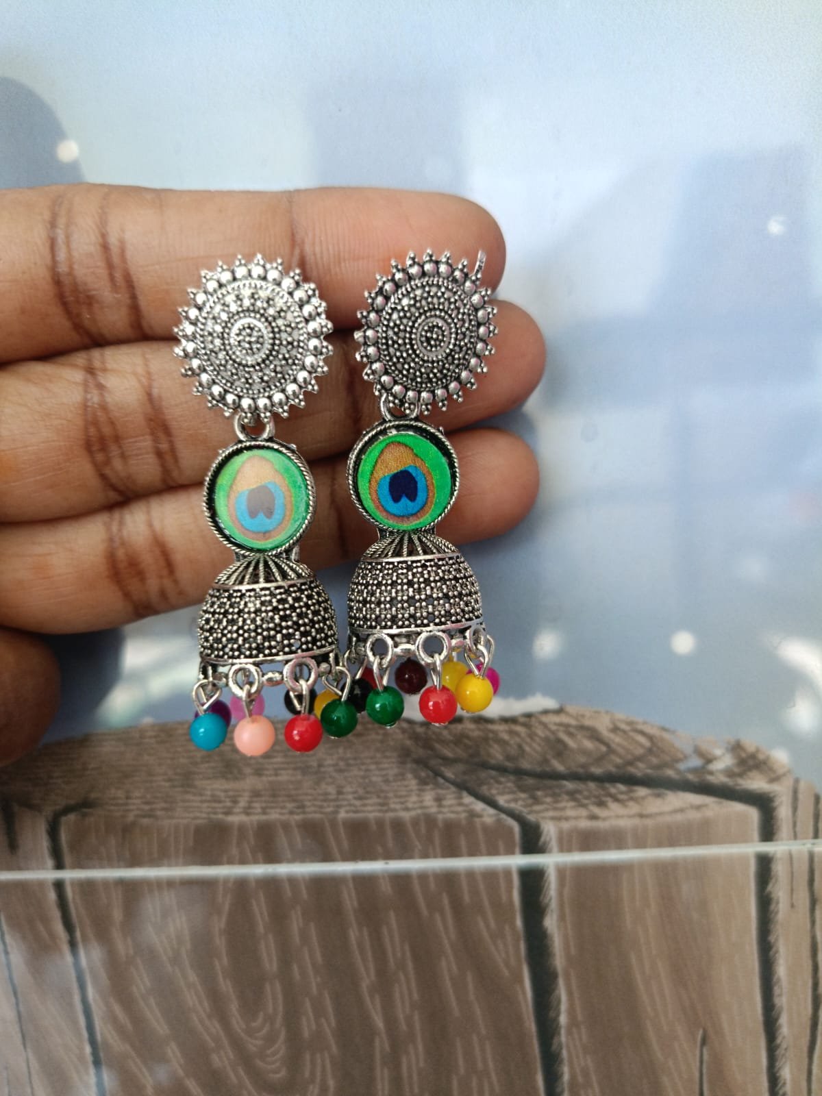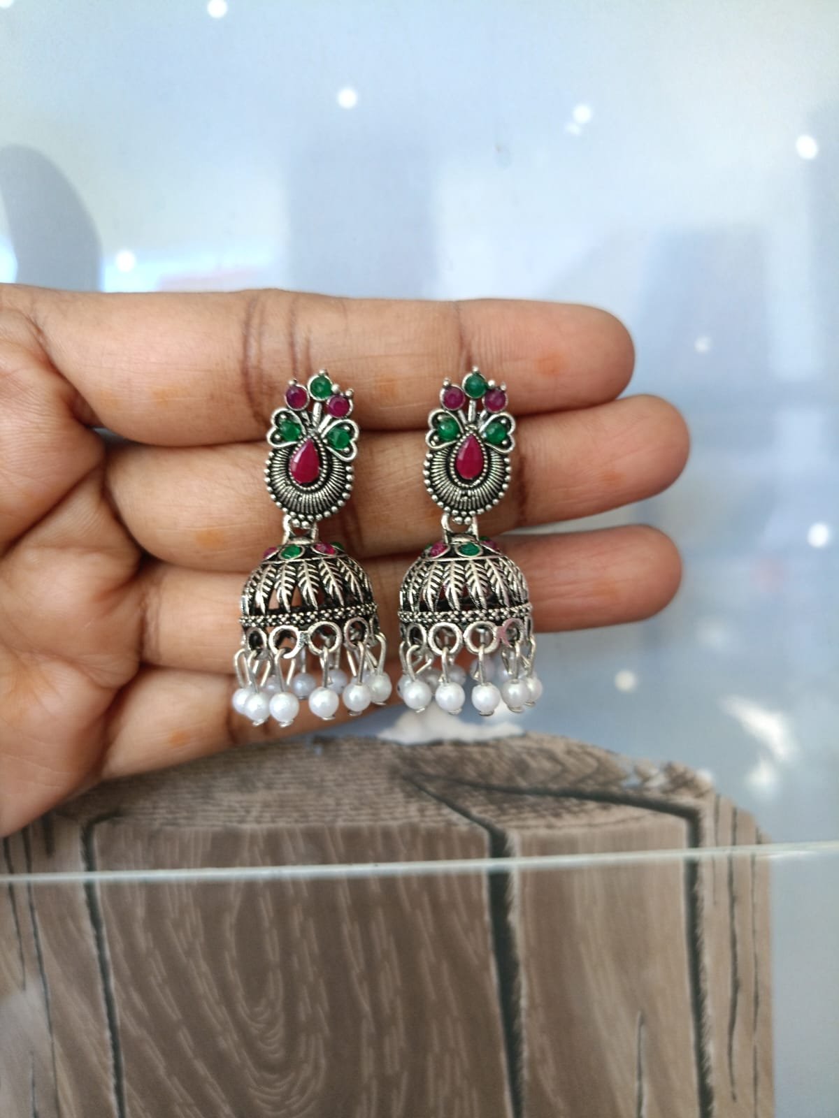 - Step into tradition with a modern twist. These oxidized silver jhumka earrings are a tribute to timeless Indian artistry, featuring ornate craftsmanship and a vintage-inspired finish.
